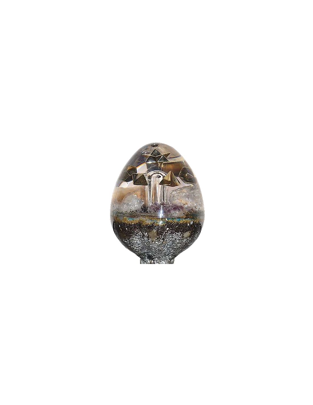 En la cúspide se encuentra una esfera de imán de neodimio y la estrella tetraédrica (merkabah) fundida en una aleación de metales cuidadosamente seleccionados y bañados en oro.