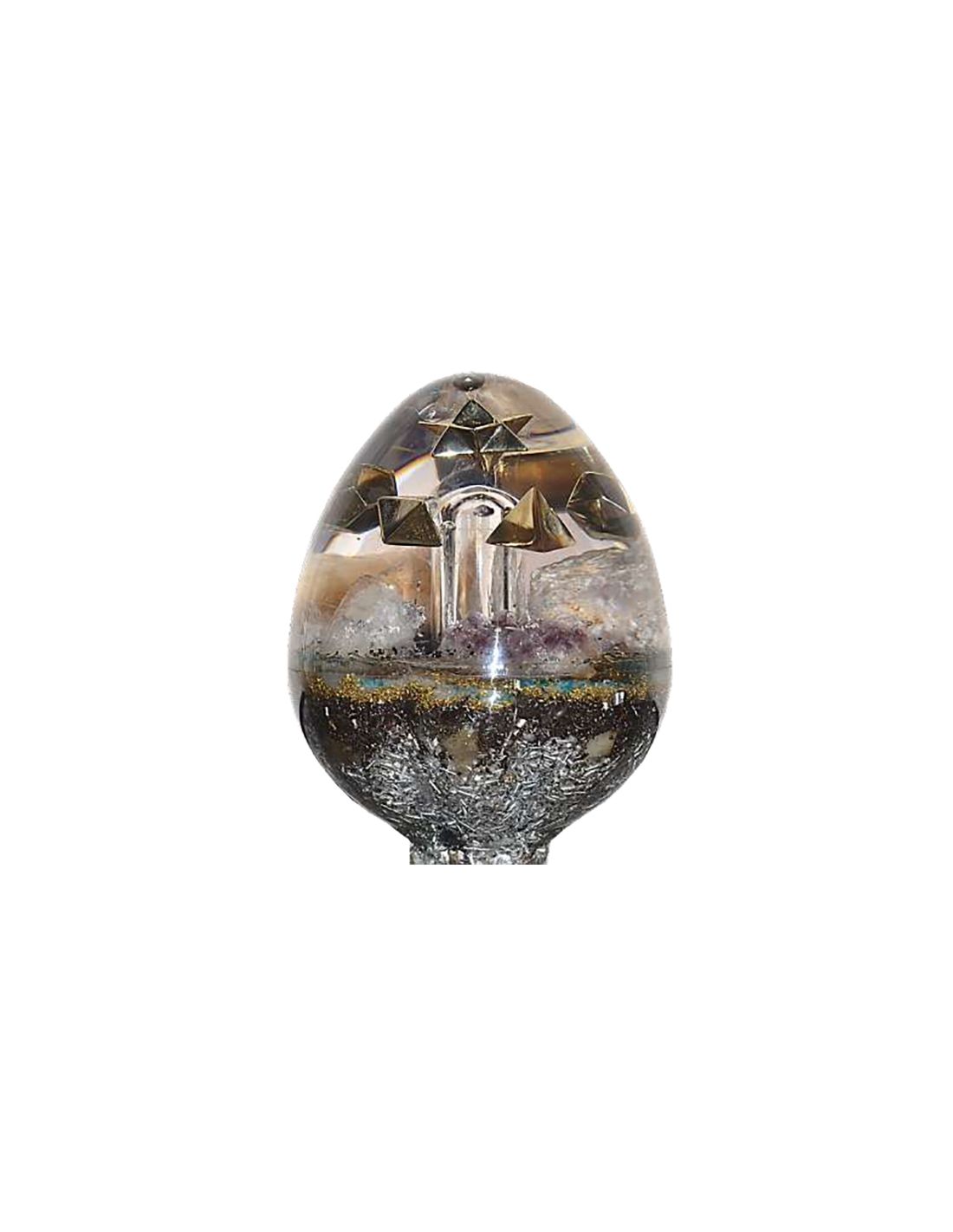 En la cúspide se encuentra una esfera de imán de neodimio y la estrella tetraédrica (merkabah) fundida en una aleación de metales cuidadosamente seleccionados y bañados en oro.