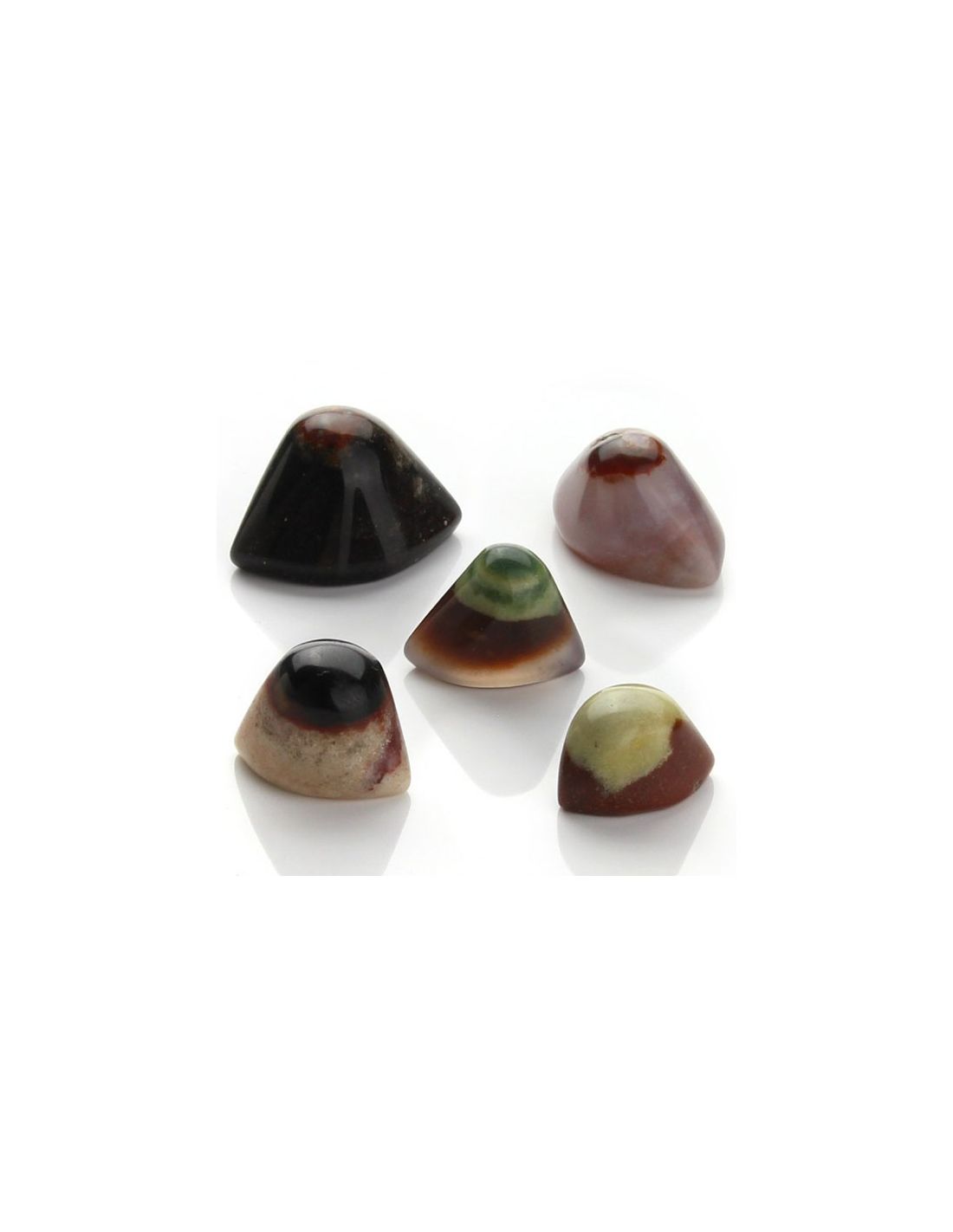 Estas piezas, conocidas como ojos de Shiva, presentan bandas y vetas propias del ágata multicolor, con un dibujo central que evoca un ojo natural.