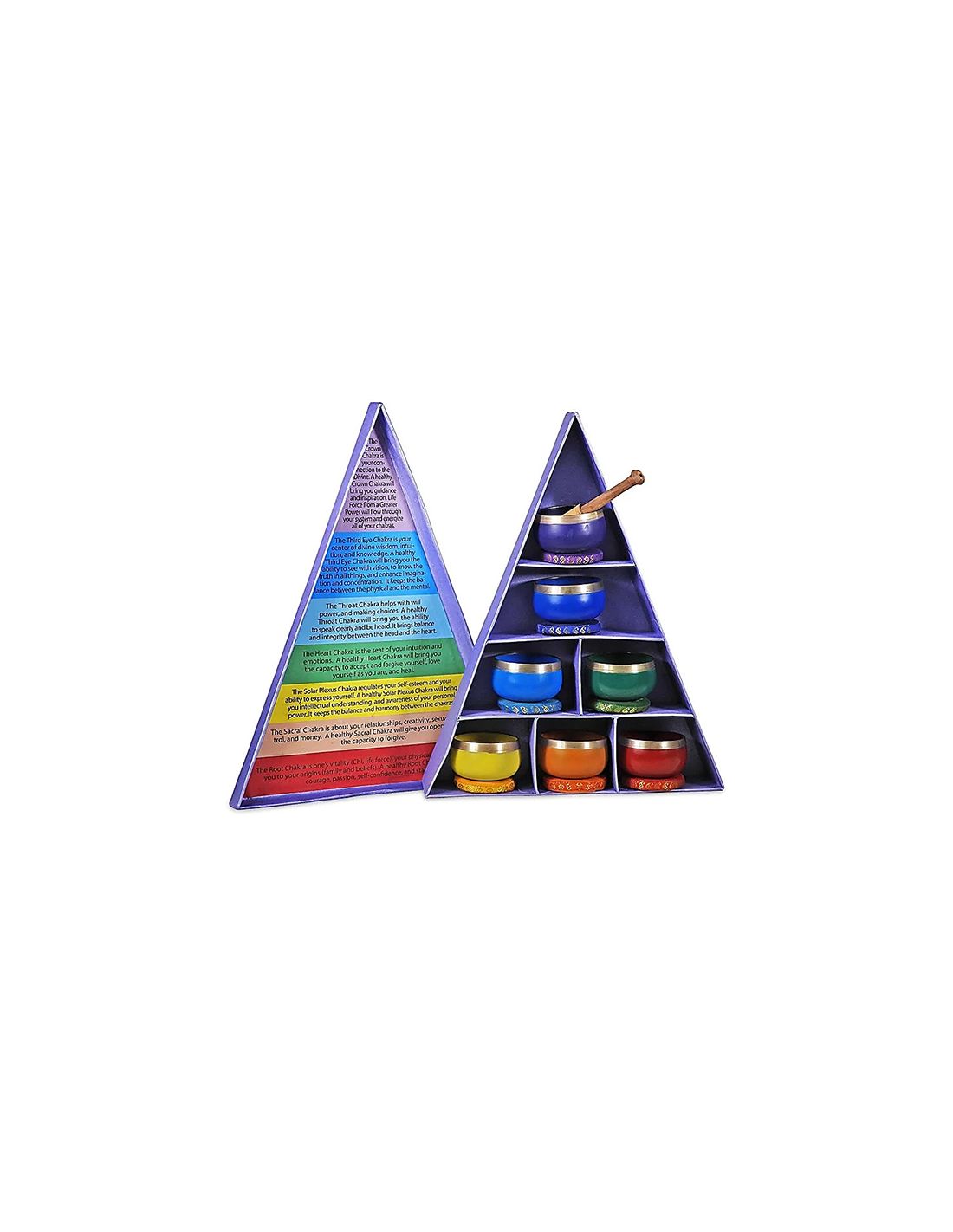 Set de 7 cuencos con los siete colores y símbolos de los chakras. Vienen en una caja de regalo triangular morada con mazo de madera y cojín.